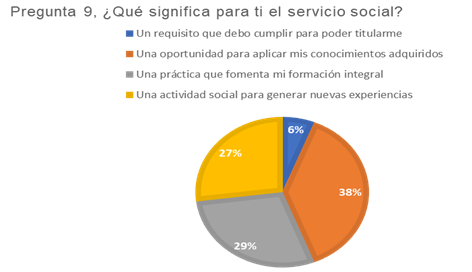 La pregunta 9, ¿Qué significa para ti el servicio social? El 38% de los encuestados manifestó que el servicio social es una oportunidad para aplicar sus conocimientos adquiridos, para el 29% es una práctica que fomenta su formación integral, para el 27% es una actividad social para generar nuevas experiencias y para el 6% es un requisito que debe cumplir para poderse titular.