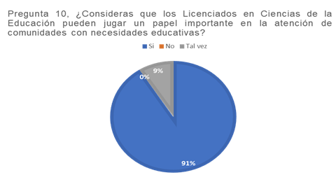 En la figura 10 ¿Consideras que los Licenciados en Ciencias de la Educación pueden jugar un papel importante en la atención de comunidades con necesidades educativas? El 91% de los encuestados considera que los futuros Licenciados en Ciencias de la Educación pueden jugar un papel importante en la atención de comunidades con necesidades educativas, mientras que el otro 9% consideró que tal vez.