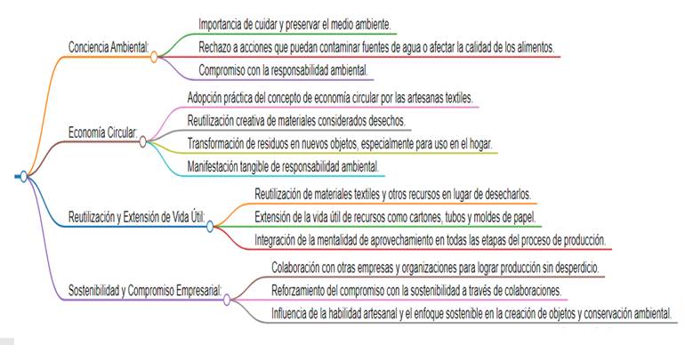 En primer lugar, las entrevistadas demostraron una profunda conciencia ambiental arraigada en la importancia de preservar el medio ambiente. Este sentido de responsabilidad se refleja en su rechazo a acciones que pueden contaminar recursos vitales, como fuentes de agua y alimentos. Además, su adopción práctica del concepto de economía circular es particularmente notable. Aprovechando la creatividad y la reutilización de restos de materiales textiles, estas artesanas transforman lo que se consideraría desperdicio en nuevos objetos de valor. Esta mentalidad no solo refuerza su compromiso con la responsabilidad ambiental, sino que también demuestra su habilidad para incorporar principios de sostenibilidad en sus prácticas cotidianas.