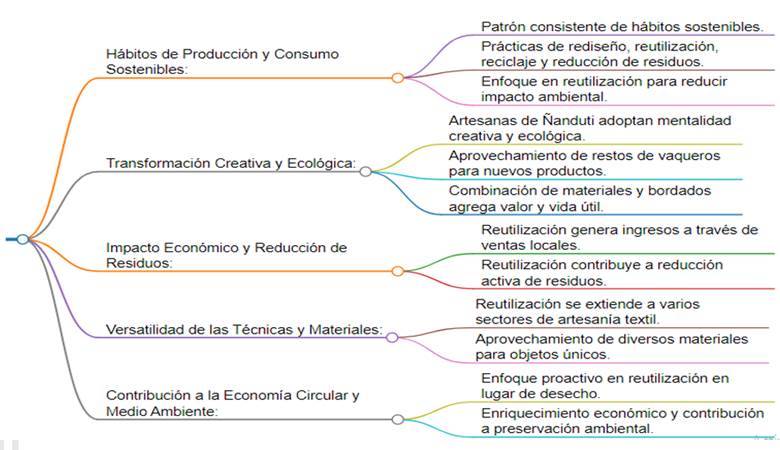 En segundo lugar, se observa un patrón coherente de hábitos de producción y consumo enfocados en la reutilización y la reducción de residuos. Ejemplificando esto, las artesanas de Ñanduti aprovechan restos de vaqueros para crear productos funcionales y artísticos, alargando la vida útil de los materiales. Esta reutilización se extiende a varios sectores de la artesanía textil, donde los materiales desechados, como telas de sábanas, pantalones y otros, son transformados en nuevos productos. Este enfoque no solo reduce la generación de residuos, sino que también genera ingresos adicionales y fomenta la economía circular.