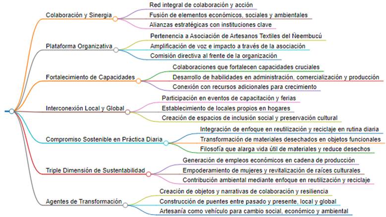 También se utilizaron mapas mentales por cada categoría de análisis para ilustrar las palabras clave repetidas en cada dimensión analizada. A través de este análisis, se establecieron otras conexiones y relaciones entre los conocimientos obtenidos de las fuentes primarias (las artesanas entrevistadas).