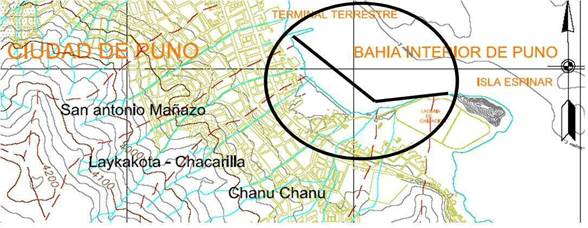 El área en estudio, de esta investigación, se encuentra ubicado a lo largo del litoral lacustre, específicamente en el sector de la bahía interior de Puno zona sur, entre el Muelle de la ciudad de Puno y la Isla Espinar, provincia de Puno, Región Puno (Ver figura 1).