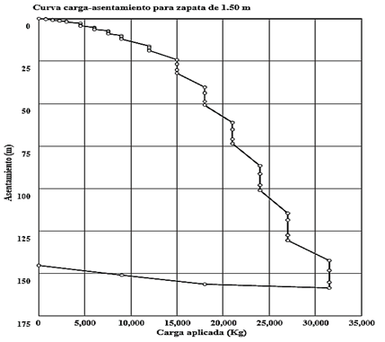Curva carga-asentamiento para la zapata de prueba de 1.50 m