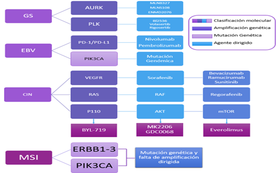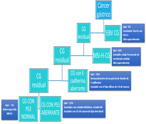 Una de las más utilizadas es la clasificación Cancer Genome Atlas (TCGA) (13). La clasificación TCGA divide el adenocarcinoma gástrico en cuatro subtipos moleculares: