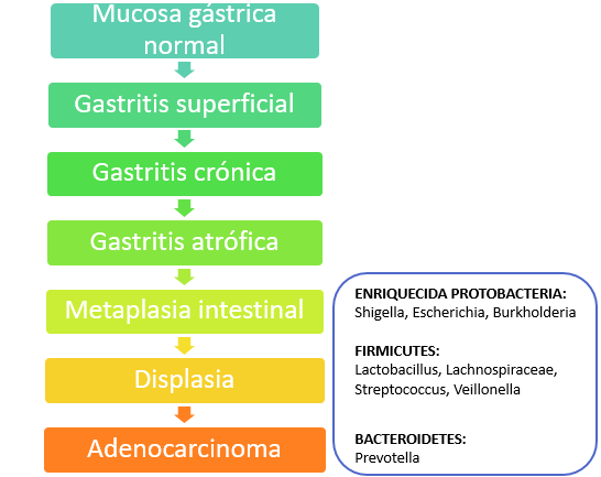 Fig. 5 Representación esquemática de los géneros predominantes en diferentes etapas dentro de la carcinogénesis gástrica cascada. Tras la infección por H. pylori, la proteobacteria y específicamente H. pylori dominan la microbiota gástrica