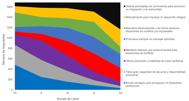 La Figura 6 muestra los resultados obtenidos relacionados a las avenidas de desarrollo que el mentor estudiantil debería considerar para el fortalecimiento en el desarrollo de sus competencias en el área de acompañamiento. El eje horizontal representa la escala de Likert , el vertical proporciona la frecuencia de alumnos que relacionan cada una de las avenidas de desarrollo en las diferentes posiciones de la escala de Likert. Un análisis transversal nos permite describir la relación entre la frecuencia con la que los estudiantes relacionan cada una de las avenidas de desarrollo y la relevancia respecto a la escala de Likert. En resumen, es posible establecer las 3 principales avenidas de desarrollo que los alumnos consideran como relevantes para el fortalecimiento del acompañamiento de un mentor estudiantil, las cuales son: Tiene información sobre la oferta de actividades de vivencia de acuerdo con mis intereses; Tiene conocimiento acerca de mis áreas de desarrollo profesional de acuerdo con mi programa académico; Tiene habilidades de consejería; las cuales acaparan el 68 % de las opiniones respecto a “totalmente de acuerdo” respecto a la muestra total de estudiantes. Es posible analizar que el estudiante identifica que el proporcionar información relacionada a actividades de vivencia de acuerdo con sus propios intereses en conjunto con el conocimiento de áreas de desarrollo profesional, facilitan el poder aconsejar a los estudiantes en los intereses personales que tienen. Es decir, no es suficiente que el mentor estudiantil conozca el catálogo detallado de las actividades denominadas como de vivencia en la institución, es decir, aquellas actividades no académicas que enriquecen el perfil del estudiante, lo más importante desde la perspectiva del estudiante, es que el mentor determine de forma personalizada cuáles son las más convenientes de acuerdo con las características e intereses individuales del alumno. De igual forma, es posible identificar que el promover y difundir actividades de vivencia en redes sociales y/o medios digitales, no es un área en que la participación del mentor estudiantil sea considerada como de gran relevancia en el acompañamiento del estudiante, si bien el mantener medios digitales es una forma de comunicación que es considerada eficiente para los alumnos de esta generación, no es una práctica que asegure el éxito de acercar al mentor estudiantil con los estudiantes de su comunidad. Podría establecerse también que el estudiante no desea ligar una actividad formal de acompañamiento en un medio que consideran como privado.