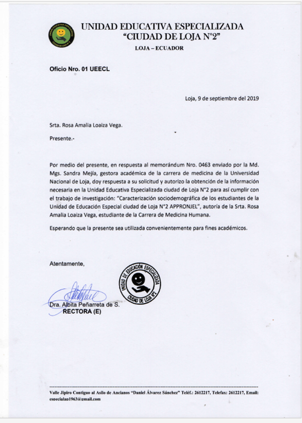 Yo, Rosa Amalia Loaiza Vega, estudiante de la Carrera de Medicina de la Universidad Nacional de Loja, estoy realizando la investigación que lleva el título “Caracterización sociodemográfica de los estudiantes de la Unidad de Educación Especial cuidad de Loja N°2 APPRONJEL.”, como parte del desarrollo de la tesis de pregrado.