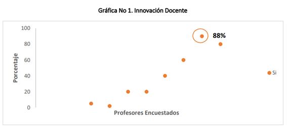 De acuerdo con las encuestas aplicadas se pudo observar que el 88% de los docentes encuestados indico que aplican la innovación dentro de las aulas de clase, mientras que el 12% de ellos comentaron que aún les cuesta trabajo adaptarse a las nuevas herramientas de enseñanza.