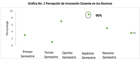 El 90% de los alumnos indican en la encuesta que consideran que los docentes no presentan innovación a la hora de presentar sus clases, a consecuencia de esto, se identificó que hay un deficiente rendimiento estudiantil. El 10% de los encuestados determino que solo algunos profesores presentan indicios y propuestas para mejorar sus clases.