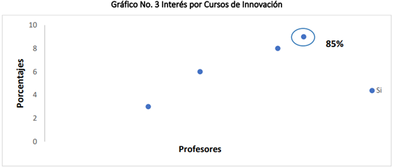 Como se puede observar en el Grafico No. 3, el 85% de los docentes se encuentran interesados en tomar cursos de innovación educativa para de esta manera adquirir nuevos conocimientos y de esta manera implementarlos y mejorar el proceso de enseñanza-aprendizaje. El 15% no está muy seguro de tomar dichos cursos debido a falta de tiempo o interés.