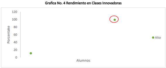 Interpretación: Los alumnos indicaron que en sus clases existía innovación, presentaron un alto rendimiento, de esta manera se puede observar que el manejo de prácticas innovativas es efectivo.