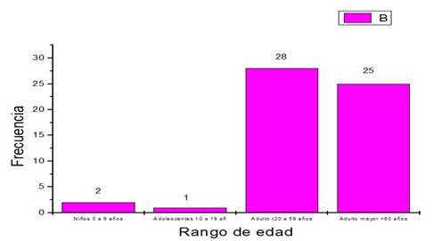 La muestra es de 56 pacientes donde según los datos referidos en la gráfica 1 se obtiene que el 50% de Adultos (20 a 59 años), adultos mayores (>60 años) con un 44.6%, mientras que el 3.6% son Niños (0 a 9 años) y paciente Adolescente (10 a 19 años) representa el 1.8%.