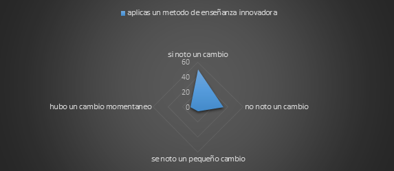 En el grafico no.4 podemos observar derivado de los cuestionarios aplicados el 85% de alumnos aplico innovación y liderazgo estratégico dentro del aula, crea en los alumnos un rol más activo a la hora de aprender y a su vez esto fomenta la creatividad, el aprendizaje. Ya que un 50% de los encuestados noto un cambio en el aula, por lo cual podemos concluir que los profesores deben asumir el papel de facilitador para que los estudiantes participen de manera más activa.