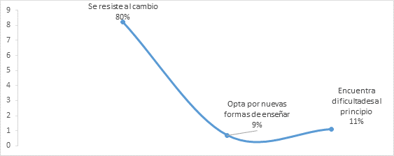 En el grafico no.5 demuestra por medio de la aplicación de cuestionarios a alumnos que el 80% de los docentes se resiste al cambio y aplicar nuevos enfoques innovadores mientras que un 9% opta por nuevas formas de enseñanza, debido a que docentes y alumnos no les gusta salir de su zona de confort por lo tanto se genera una resistencia en adoptar nuevas formas de enseñanza dentro de los cuales algunos lograron hacer un cambio en su forma de enseñar.