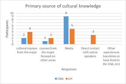 On the other hand, most participants from UH pointed out that media was their primary source of cultural knowledge, followed by cultural courses from the major, direct contact with native speakers and courses from the major focused on other areas.