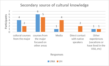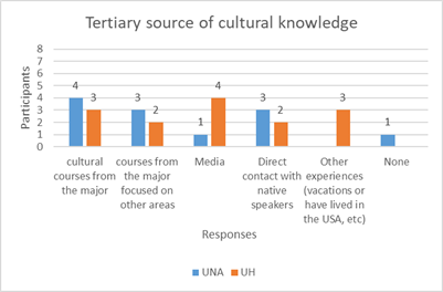 As shown in figure 3, four out of 12 participants from UNA selected cultural courses from their major as their main tertiary source of cultural knowledge, followed by courses from the major focused on other areas and direct contact with native speakers. On the other hand, most UH participants identified media as their main tertiary source of cultural knowledge, followed by cultural courses from the major and other experiences.