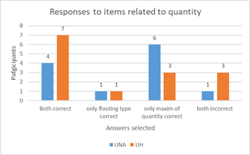 The majority of participants from UNA answered incorrectly at least one of the two items presented; participants selected answers related to stereotypes towards Americans such as rudeness, lacking cultural awareness, and snobbish attitude. In the case of UH, half participants answer incorrectly at least one of the two items from the questionnaire, and these participants selected the same options that contained stereotypes as UNA’s students did. Nevertheless, UH students performed better when interpreting both items related to quantity, while UNA students had more troubles to interpret the item based on the flouted maxim of quantity.