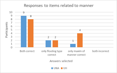 Items related to manner presented promising results; as presented in figure5, 17 participants from the total population answered correctly both items by choosing interpretations related to American assumptions such as assertiveness and sense of privacy. Only eight out of the 26 participants selected interpretations related to rudeness, and one a non-related answer. From the nine students that failed at least one of the two items presented, five had problems to interpret correctly the item based on the flouting maxim of manner; a possible reason for these results might be that the ambiguous nature of the flouting maxim of manner represents an obstacle to interpret an implicature of such nature. Nassar’s (2021) findings point out that one of the reasons for misinterpreting conversational implicatures are differences in cultures, and that deliberate ambiguity was one of the factors that showed culture difficulty (p. 51). Therefore, the fact that 17 participants answered correctly to both items might suggest that ambiguity might not be a problem if certain ideas or assumptions, such as the sense of privacy and assertive communication, are shared within different cultures.