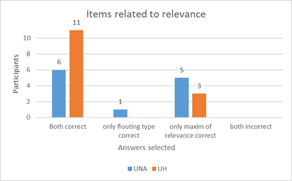 Overall, as shown in figure 6, 17 out of 26 participants answered correctly both items. These results are similar to Kasper and Blum-Kulka’s (as cited in Kavetzka, 2020) where it was stablished that it was easier to comprehend violations of relevance maxim, while violation of quantity maxims were more difficult to comprehend (p. 46). Most participants from both UNA and UH had no difficulties to interpret both items as expected, but still, UH participants performed better at doing so. Half of UNA’s participants interpreted both items correctly, and almost half of the same population interpreted correctly only the item following the maxim of relevance. All participants who answered incorrectly at least one of the items selected, interpreted them as speakers changing the topic or not caring about others’ opinions and wishes. Nine out of 26 participants did not interpret the items as a reflection of the American values patriotism and protection of the family. Results might suggest that rather lack of cultural knowledge, flouting maxims of relevance might be harder for them to interpret whether they lack or not cultural knowledge, and this might be due to the nature of the flouting maxim itself.