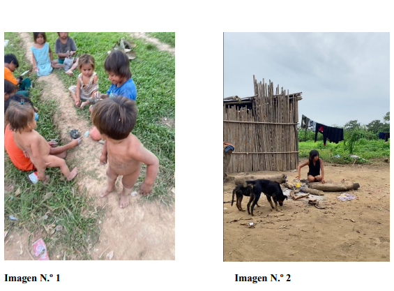 En las fotografías N 1 constatamos como los niños, tienen cambios corporales y físicos como sintomatologías producidas por contaminación por el mercurio, véase el cabello y los estómagos; en la fotografía N 2, observamos como la mujer, joven madre calienta y desinfecta el agua de río en un envase plástico de refresco pet, para posteriormente darle a su hijo y ser consumida por la familia.