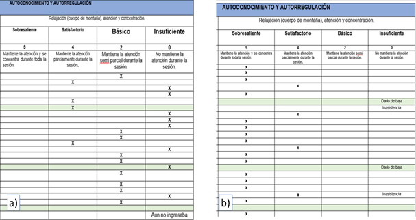 a) Rúbrica de registro “Meditación” sesión 1.b) Último registro de la estrategia “Meditación” sesión 20.