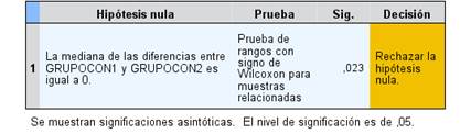 Nota. La figura muestra la prueba de hipótesis con la prueba Wilcoxon para muestras relacionadas antes y después de la intervención (grupo control). Fuente: elaboración propia, 2023.