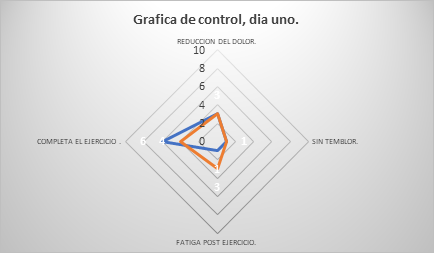 · El dolor durante los ejercicios isométricos no supera 4 en IPP. · Unisonó en la interpretación del tipo de dolor que tienen. · Dificultades al realizar los ejercicios, debilidad o interrupción del ejercicio. · Función normal de musculatura en flexión y extensión de codo. · Los participantes logran rangos articulares completos, estos son evaluados de manera lenta y controlada. · Datos de goniometría activa con mejores rangos en movimientos. · La mayoría refiere fatiga fuerte/extrema al realizar los ejercicios. · A los participantes con temblor por fatiga mayor a 10 segundos se los interrumpe y se inicia una siguiente repetición. · Siete participantes no lograron completar los 40 segundos por debilidad o temblor (se anota el mejor tiempo de las series). · Ningún paciente refiere dolor con relación al ejercicio de los anteriores días. · Los participantes indican ligera mejoría en las actividades de la vida diaria y dolor. · Varios participantes refieren demasiado esfuerzo, al realizar dos repeticiones se reduce el peso en un kilo. |
