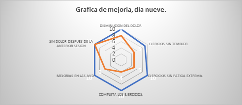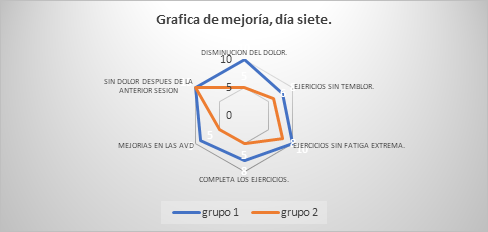 La mejoría en las actividades diarias sumado a la disminución del dolor fueron el común denominador dentro del estudio realizado, los participantes día tras día lograban mejorar sus actividades y lo comunicaban con mayor confianza al resumir un poco de su evolución, también se encontraron cambios importantes en la seguridad y confianza para realizar actividades y los ejercicios, la evidencia mas los relatos de los participantes demostraron que la mejoría fue integral y multifuncional.