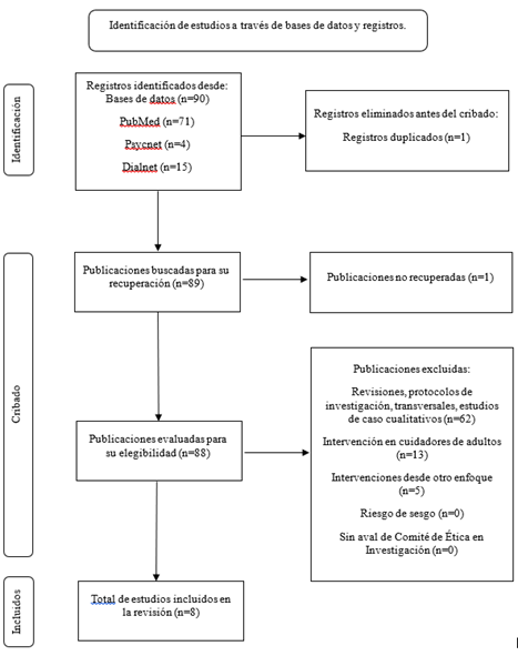 Antecedentes: Ser cuidador de una persona con alguna enfermedad representa un impacto en la vida del cuidador, tanto social, psicológico y biológico, incluyendo síntomas de depresión, ansiedad o estrés, estos síntomas se incrementan al ser cuidador de un niño con alguna condición médica, resultando necesario implementar tratamientos enfocados en estos síntomas y el bienestar percibido, por lo tanto, el objetivo de este estudio es resumir sistemáticamente las intervenciones desde la Terapia de Aceptación y Compromiso, dirigidas a cuidadores familiares o padres de niños con algún tipo de discapacidad o enfermedad crónica. Método: Se realizó una revisión sistemática en inglés y español en las bases de datos Pubmed, APA Psynet y Dialnet del 2017 al 2023, siguiendo la Declaración Prisma y realizando una estimación de riesgo de sesgo de cada estudio. Resultados: Se obtuvo un total de 8 investigaciones de diferentes partes del mundo, indicando resultados positivos en la reducción de las variables de estudio en cuidadores de niños, donde la mayor cantidad de población intervenida fue femenina con perfil de madre. Conclusiones: Es necesario generar mayor evidencia científica sobre los resultados de estas intervenciones para el contexto Latinoamericano, incluyendo intervenciones combinadas entre los conceptos de la Terapia de Aceptación y Compromiso con otros enfoques complementarios, como Mindfulness.