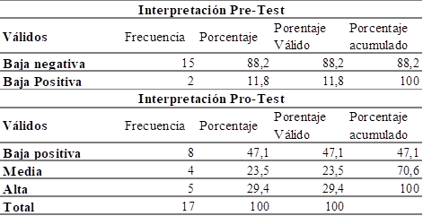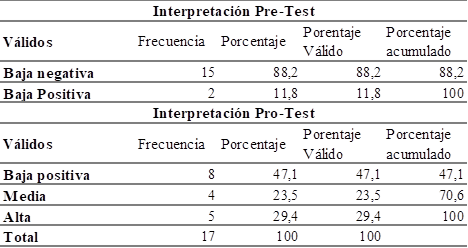 En la tabla 1, se puede apreciar de manera descriptiva las puntuaciones con relación a los niveles de creatividad de la pre y post intervención con base del instrumento Crea, en donde se categorizo los niveles de creatividad con variables de la creatividad baja negativa, 2 creatividad baja positiva, 3 creatividad media y 4 creatividad alta. Por lo tanto, los resultados arrojan en la valoración estadística de la Media, un aumento de 1,1176 estipulado como creatividad baja negativa a baja a 2,82 valor categorizado dentro de los rangos de creatividad media. Datos reflejados en la tabla 1.