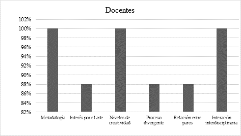 En la figura 1, se evidencia que el 100% de los educadores sostienen que los estudiantes incrementaron sus niveles de creatividad mediante el arte como herramienta pedagógica. En un 88% mejoró la correlación de los estudiantes con el docente, entre pares y el entorno social del curso. Mientras que un 66% cambió la actitud con relación a las técnicas y metodologías de enseñanza-aprendizaje