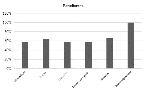 De igual manera, a partir de la entrevista de satisfacción aplicada a los estudiantes participantes de la propuesta, se determina que un 58% aumentaron su interés por metodologías de aprendizaje artístico. El 64% aumentó sus niveles de creatividad y en 58% el proceso divergente. Un 66% considera que se mejoró la relación entre pares y el ambiente del curso y el 100% de los estudiantes afirma que estas propuestas deben ser integradas a otras asignaturas del nivel. Por lo tanto, se evidencia que la educación actual necesita de espacios que fomenten metodologías holísticas e integradoras para motivar al estudiante e involucrarlo en los procesos de aprendizaje, mejorando así la calidad educativa (Bernal, 2020). Resultados que se reflejan en la figura 2.