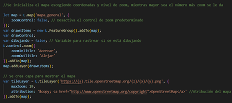 En la figura 2, se muestra el código necesario para inicializar el mapa en donde se le brindan varios parámetros para su despliegue.