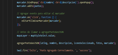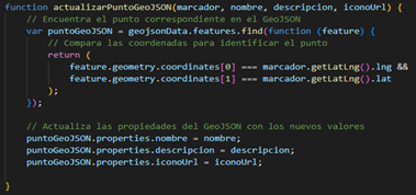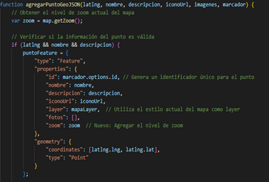 Como se mencionó anteriormente, cuando un punto es agregado al mapa también es agregado al mismo tiempo al archivo GeoJSON. Por lo cual, se muestra a las funciones que se encargan de realizar estas acciones, pero para el archivo GeoJSON, como se puede revisar en las figuras 6, 7 y 8.
