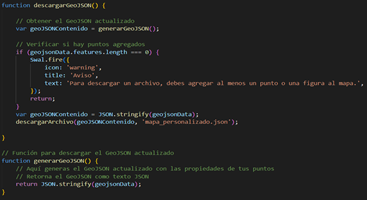 Gestión de archivos: La aplicación permite respaldar los datos con las modificaciones realizadas mediante la descarga del archivo GeoJSON, para que el usuario pueda utilizar estos datos más adelante, ya que en la aplicación desarrollada también se puede cargar un archivo que contenga las propiedades establecidas para poder retomar el trabajo y agregar o eliminar características según sea necesario. En la figura 9, se visualiza la función que permite llevar a cabo todo el comportamiento descrito.