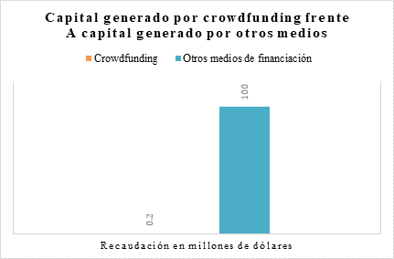 Finalmente, la generación de capital obtenido por start-ups mediante crowdfunding en comparación al valor obtenido por otros medios nos indica una brecha inconmensurable entre la cantidad de capital generado por medios distintos del crowdfunding y este último.