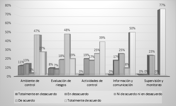 En el gráfico 1 se presentan los resultados absolutos en forma porcentual de las dimensiones que miden la implementación del control interno en una empresa gastronómica. En este sentido se puede apreciar que las dimensiones del control interno implementadas de manera más sólida (totalmente de acuerdo), son la dimensión de supervisión y monitoreo (77%), seguido de información y comunicación (50%), y actividades de control (39%). Las dimensiones; ambiente de control (47%) y evaluación de riesgos (48%) se ubican en la escala de acuerdo. Estos hallazgos demuestran que existe una intensificación en el proceso de control, información y supervisión, pero la administración hace menos hincapié en crear un ambiente de control basado en políticas establecidas y en evaluar los riesgos. Sin embargo, es claro que la empresa cuenta con un sistema de control interno que según argumentan Zafar y Saeed (2019), es crucial para garantizar el éxito financiero y operativo de una empresa gastronómica. Según ellos, un buen sistema de control interno permite a las empresas gastronómicas detectar y prevenir fraudes y errores en la gestión financiera, lo que puede resultar en ahorros significativos de costos y aumentar la confianza de los inversores.