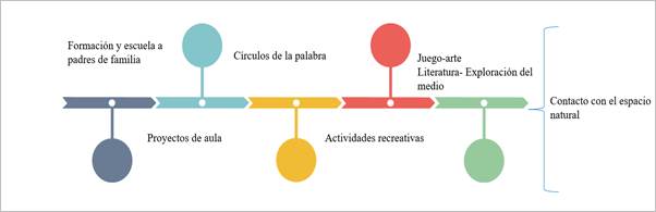 La Educación inicial requiere unas actividades rectoras en conexión con la educación inicial y su incidencia con el territorio, la cotidianidad y experiencia de quienes participan de la educación infantil en territorios con rezago social, en el grupo focal se devela la urgencia por trabajar desde un referente teórico las actividades rectoras (arte, juego, literatura y exploración del medio) como una panacea pedagógica para la atención integral y el desarrollo humano de los niños y las niñas, a partir de esta premisa se exalta la pedagogía Waldorf (Steiner, 2004) como mediación educativa, la cual coincide con los intereses y proposiciones pedagógicas expresadas por las AE en el grupo focal, este hallazgo devela la necesidad de trabajar la educación inicial sustentada en bases teóricas que permitan su sinergia ontológica con la práctica.