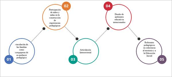 El gobierno Colombiano sigue los principios del Consejo de Política Económica y Social (CONPES 109, 2007), como hito histórico para a la construcción de la política de primera infancia en el país, ley 1804 de 2016, allí se enmarcan unas acciones concretas que permiten mitigar fenómenos de vulnerabilidad a las que se exponen las infancias especialmente en territorios periféricos del país. Desde esta perspectiva, se contempla entonces atender a la primera infancia a partir de estructurantes que garanticen la vida digna de los niños y las niñas, se reconoce la salud, alimentación, recreación, participación infantil, la educación inicial, el cuidado y la crianza como una panacea en el desarrollo digno e integral de los niños y las niñas.